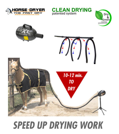 VELOCIZZA LA CLASSICA ASCIUGATURA CON COPERTAModo veloce e Ecofriendly per asciugare i cavalli usando la propria coperta 10 12+ min.Ideale per la salute del cavallo dopo il lavaggio o una cavalcata nella stagione invernale.La tua coperta da asciutta assorbe perfettamente l’acqua. Horsedryer® mantiene asciutta la coperta che cosi assorbira l’acqua dal cavallo.Horsedryer® velocizza il processo di asciugatura della coperta. Alla fine cavallo e coperta saranno asciutti evitando l’uso delle non ecologiche lampade.