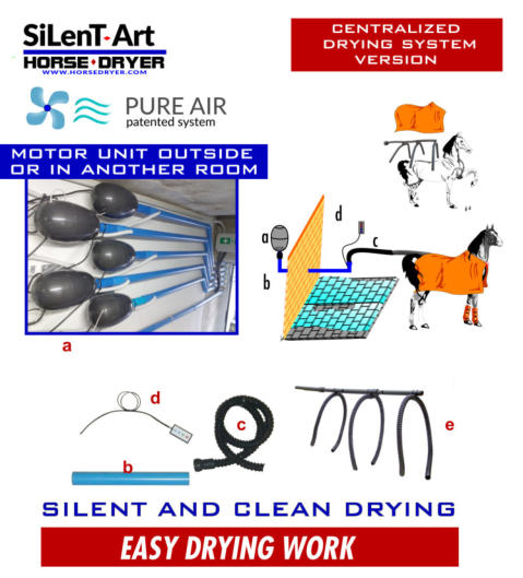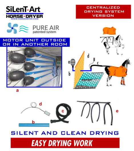 Cos'è "Silent-ART-System-HORSEDRYER® " ?a- Un motore speciale, posto all'esterno del salone o in un'altra stanza.b- Un tubo di collegamento rigido di 5 cm. di diametro.c- Un tubo flessibile collegato al sistema interno.d- Sistema a piastre con interruttore per il controllo della potenza e della temperatura.e- "Unità Spider". I pulsanti non hanno l'alimentazione elettrica, ma semplicemente un sistema di sincronizzazione a bassa tensione, ogni posizione di lavoro ha un motore e una unità spider. Sempre pronto all uso.