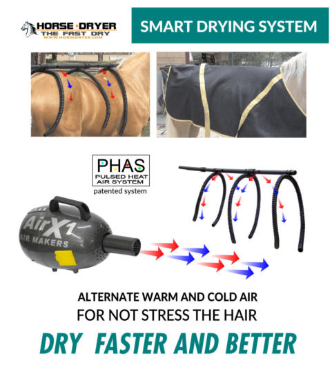 PHAS SISTEMA AD ARIA PULSATAEsclusivo sistema brevettato ad aria calda pulsata per la massima cura del pelo.Si alternana aria fredda e calda per non stressarlo.Pulsed hot air system per la massima cura del tuo cavallo. Riduce i tempi di asciugatura.